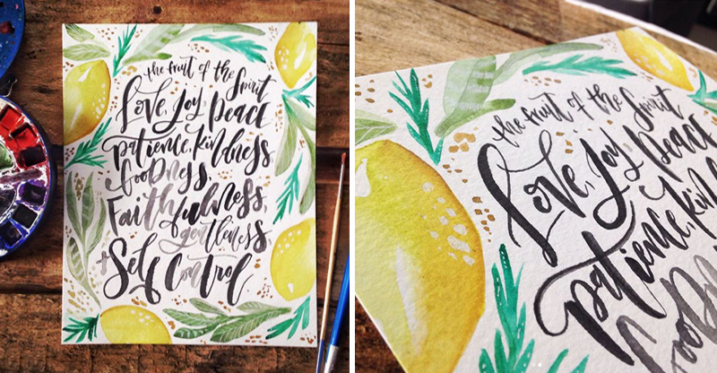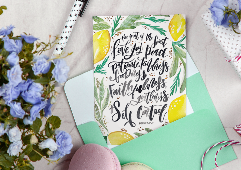 After a church pastor found a painting I had in my Etsy shop, he requested to have me design a greeting card using the same art for the cover. I was able to take my original watercolor painting, scan it in, and format the file for printing. The verse featured is known as the Christian “fruits of the spirit” from Galatians 5:22-23.