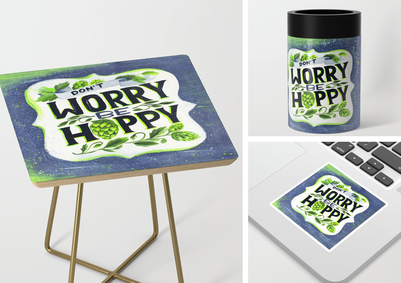 A play on the phrase “don’t worry, be happy”, I created this “don’t worry, be hoppy” art as a tribute to all things craft beer and I.P.A.’s. I hand-painted this design featuring my modern lettering and cute hops using acrylics on canvas. I then scanned the art into my computer and used it’s being produced on stickers, small tables, can coolers, and wall art available on Society6.