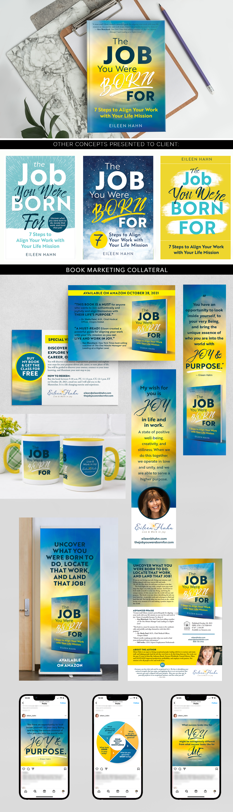 Eileen Hahn has a unique passion and purpose for helping people find joy in work and life. She radiates optimism, enthusiasm, happiness, and joy -- qualities her book cover also needed to emulate. I created a book cover that follows her brand using a combination of traditional typography and digital hand lettering to create a modern, yet creative cover that appeals to all audiences, no matter the vocation. Along with the book cover, I created a number of supporting collateral to help market her book, including postcards, bookmarks, banners, sell sheets, mugs, and social media images.
