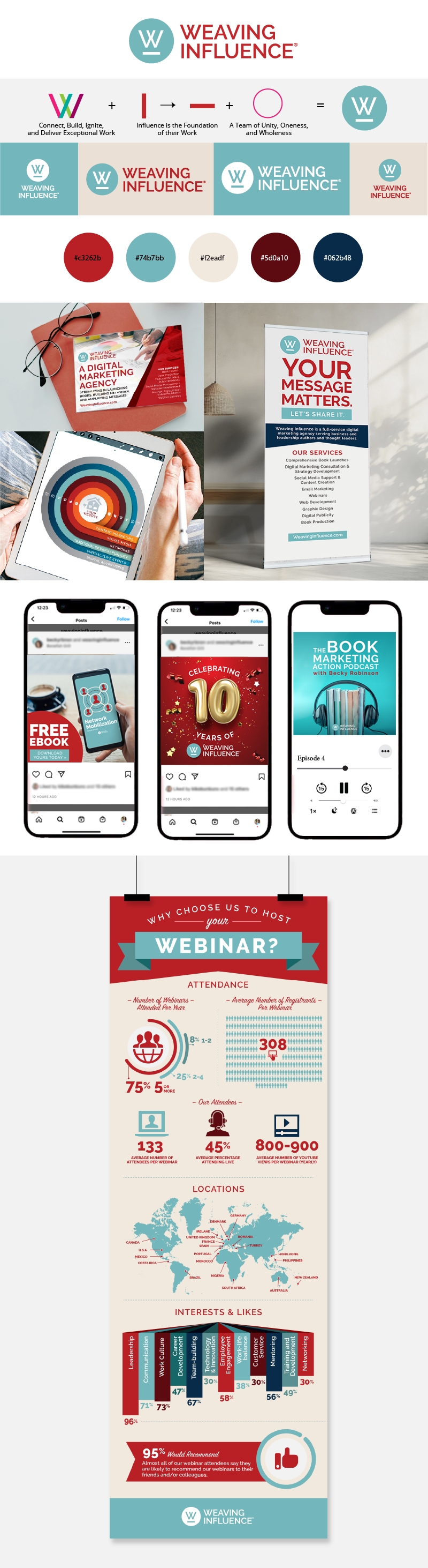 After transitioning from a small startup to a full-on agency serving clients around the globe, it was time for Weaving Influence to have an identity that reflected it’s professional services. I created the logo, print graphics graphics, and design of the new site along with the site graphics. Above shows the logo, influence building icon, values icons, promotional print materials, infographic, social media graphics, and their podcast cover.